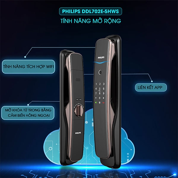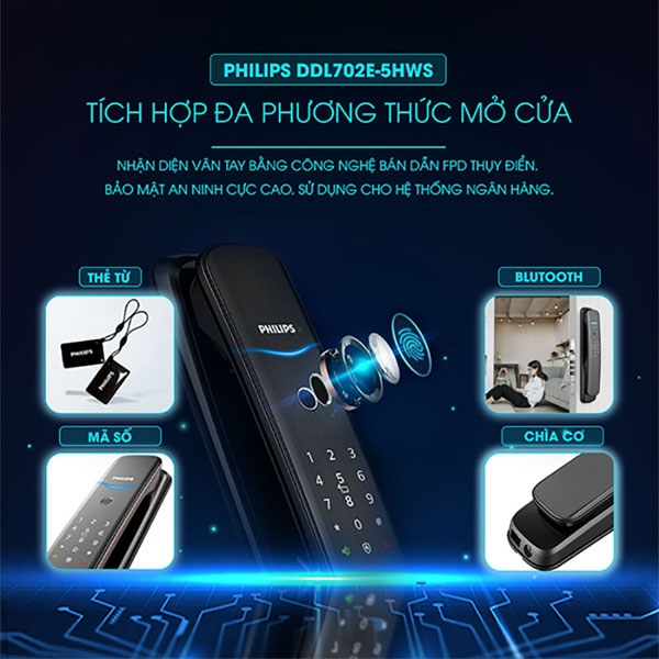 Philips DDL702E-5HWS cho phép người dùng mở khóa bằng 5 phương thức mở cửa chính: vân tay, thẻ từ, mã số, chìa cơ và app điện thoại. Mở khóa chỉ cần việc lựa chọn 1 trong 5 tính năng để mở cửa dễ dàng.