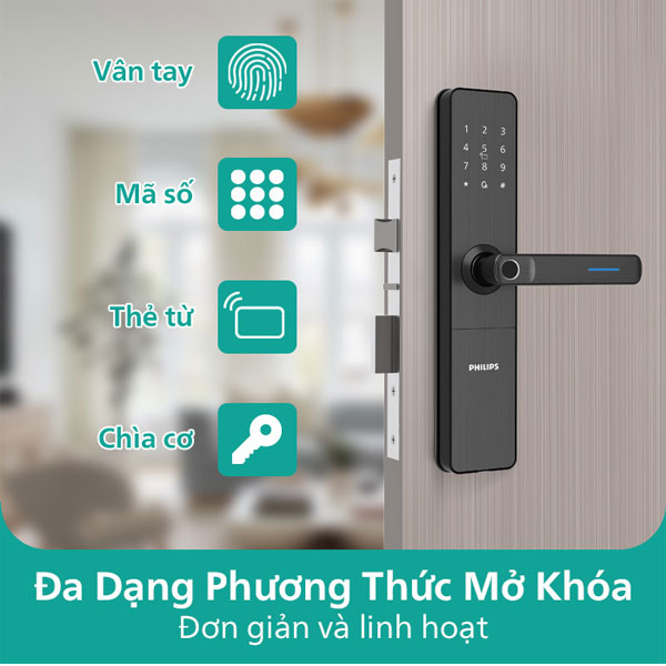 Khóa cửa philips DDL609-5HS mở bằng Vân tay, mã PIN, thẻ chìa khóa và chìa khóa cơ là những phương pháp mở khóa có sẵn, có thể đáp ứng nhu cầu khác nhau của người dùng và được áp dụng cho cả gia đình.